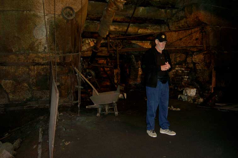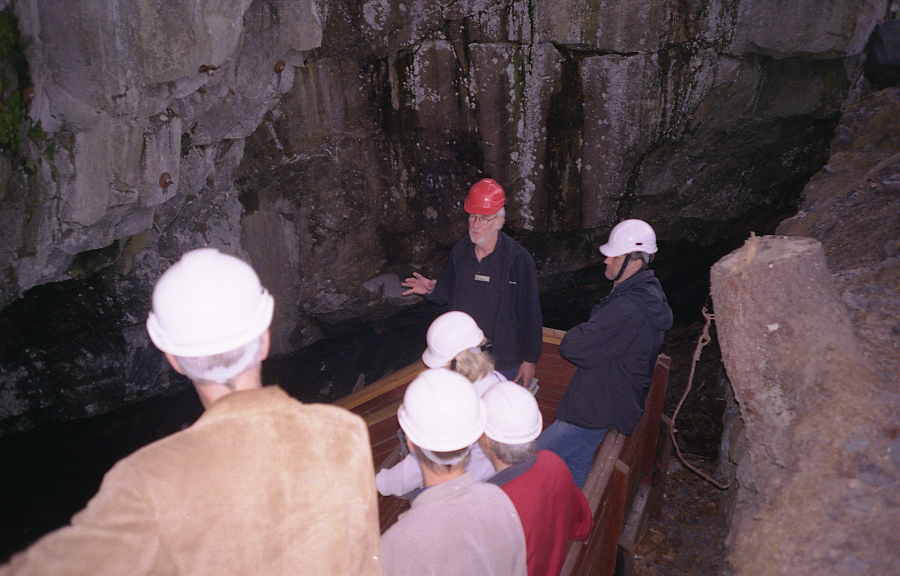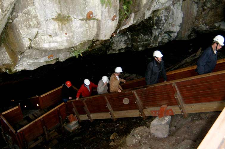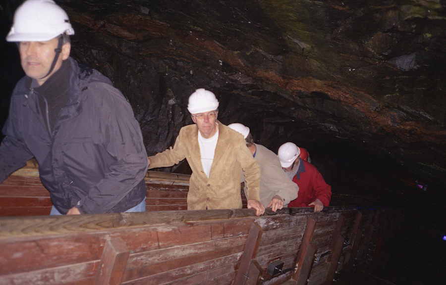 Vi gick ner ett trettiotal meter på trätrappor i den ganska nyligen iordningställda snett lutande gruvan, vari det en
