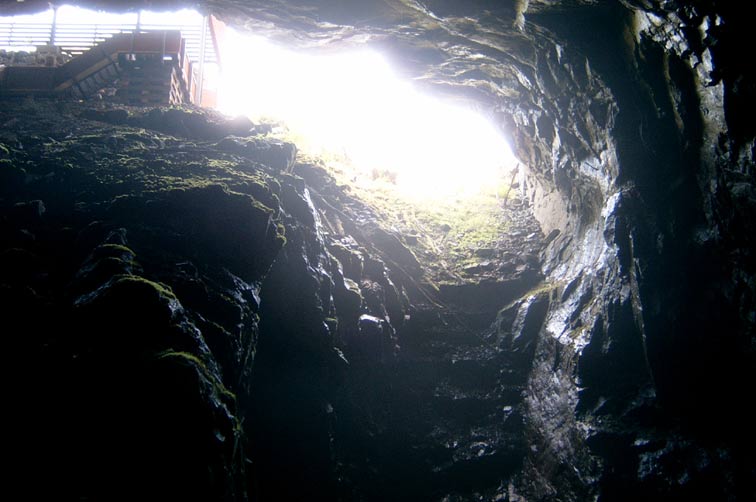 Det snett lutande schaktet är ganska nyligen iordningställt som besöksgruva med belysning och gedigna trätrappor.