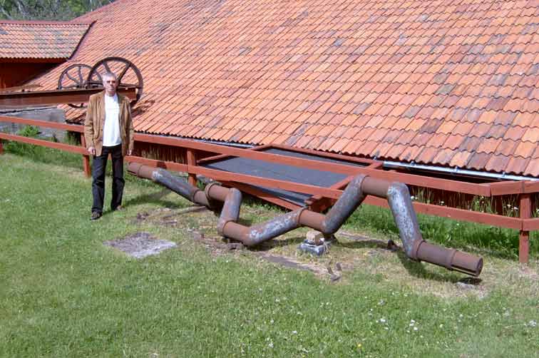 Jan står intill kamaxelm som drev luftbälgarna till masugnen.