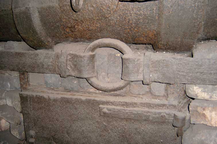 Masugnens tegelstenar hålls samman av järnförband, som kan expandera av värmen.