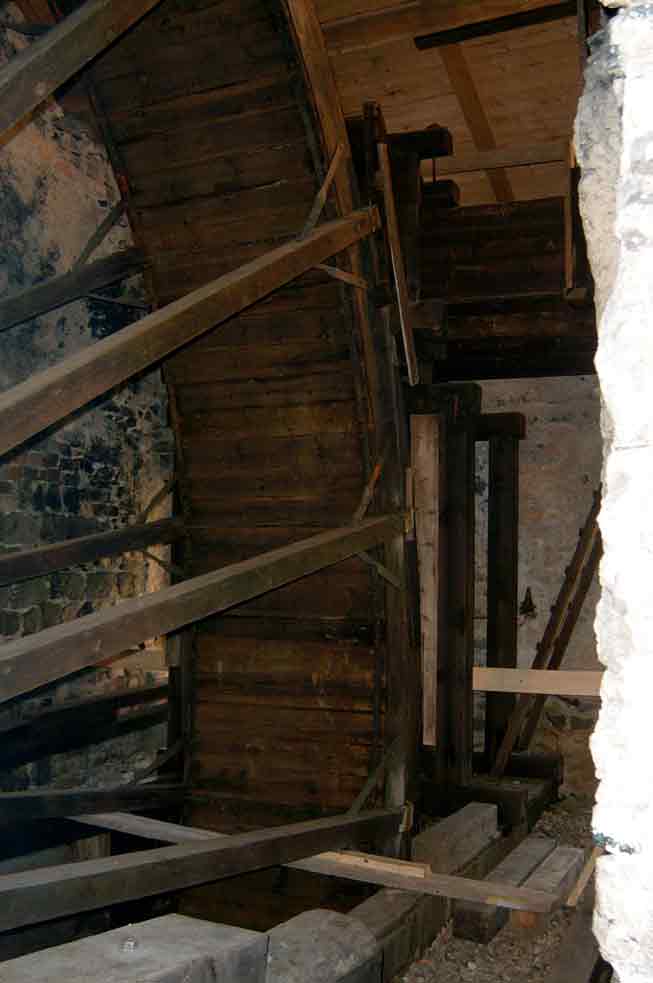 Vattenhjulet i hjulhuset driver stånggången. Observera den slaggstenen i väggarna.